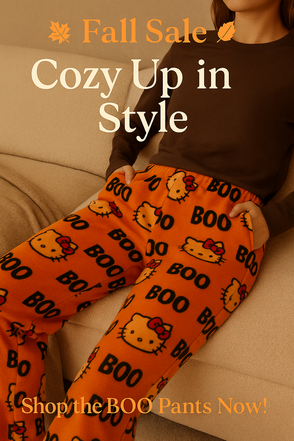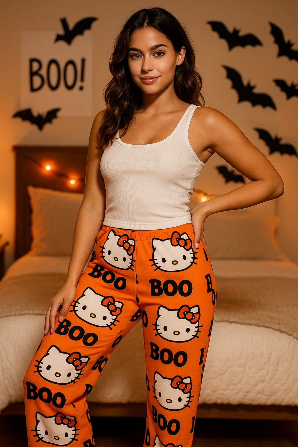 Celebrate the season of cozy nights and crisp air with our limited-edition Halloween “BOO” Pajama Pants. Designed in a bold pumpkin-orange hue with playful Hello Kitty faces and festive “BOO” prints, these pants are perfect for lounging, cuddling, or sipping pumpkin spice in style. Soft fleece fabric and a relaxed fit make them your go-to choice for ultimate comfort this fall.